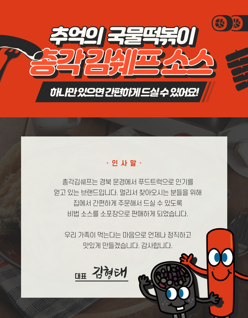목록 본문 제품 정보 총각 김쉐프 경북 문경에서 푸드트럭 맛집으로 소문난 총각 김쉐프입니다. 대표자 김형태 홈페이지 https://smartstore.naver.com/chonggak-kimchef 연락처 010-9668-5411 제품설명 댓글 1 댓글목록 등록된 댓글이 없습니다.